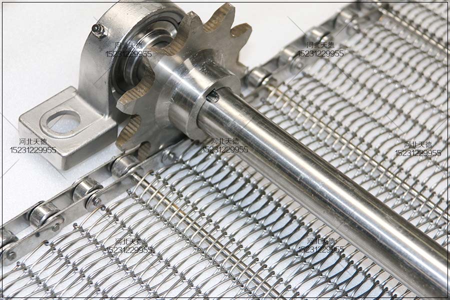鏈條式不銹鋼輸送帶的寬度為900毫米,長度為40米,輸送鏈條的節距為38.1毫米,桿直徑為8毫米,3節一根,絲徑為1.5毫米,孔為10*15毫米,不銹鋼304材質。我們還可以采用鋼板折彎打孔輸送帶,但是相比之下這種板式的不如鋼絲編織的這種透氣和烘干的效果好。