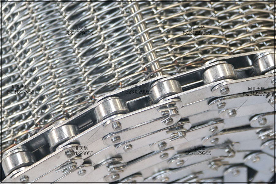 鋼絲編織鏈條輸送帶:長度50米,輸送面積寬度460mm,鏈條節(jié)距38.1mm,串桿直徑8mm,串桿間距:3節(jié)一根,絲直徑:1.2mm,鋼絲編織螺距8mm,鋼絲編織節(jié)距15mm,擋邊高度3公分,擋邊厚度1.2mm,全部材質(zhì)不銹鋼304材質(zhì),耐高溫耐酸堿耐腐蝕。