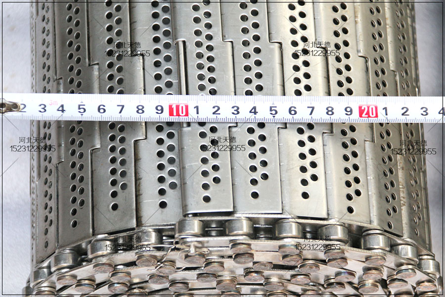 金屬網帶采用鏈條與鋼絲編織的形式加工的,總寬度是80公分,總長度為10米,食品輸送機的輸送距離是5米,絲徑是1.5毫米,孔大小為15*20毫米的,鏈條節距為38.1毫米,中間支撐采用直徑8毫米的不銹鋼304材質支桿鏈接,根據咱們輸送的重量加工成3節一個桿,鏈條金屬網帶在使用的過程中主要是靠支桿來承載物品的。