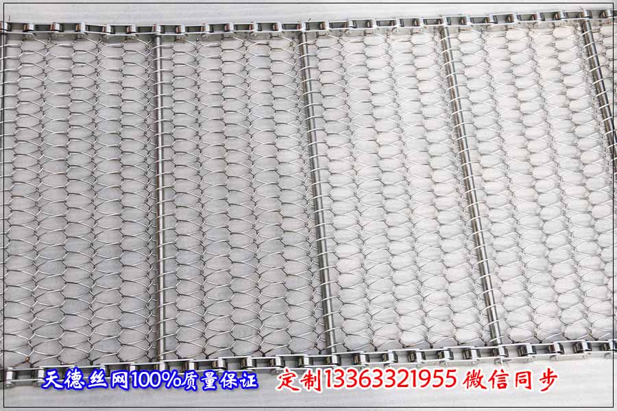 今天上午湖北咸寧客戶來電咨詢鏈條式不銹鋼網帶,用來蒸煮熱干面,干面如同蕨根粉般粗細,在經過一番的了解后,定制規(guī)格為: 食品輸送網帶我們采用不銹鋼304材質,這樣不會影響食品的質量,干凈衛(wèi)生,能夠保證面條的原有鮮味。面條輸送網帶采用的結構形式為鏈條式不銹鋼網帶,鏈條網帶總寬為40公分,長為20米,每米輸送網帶上面的載重量在10公斤以下,根據輸送使用絲徑為1.0毫米,根據輸送面條的大小不銹鋼網帶的孔定制為5*10毫米,不銹鋼鏈條網帶的節(jié)距為25.4毫米,不銹鋼圓棒支撐桿直徑為6毫米,圓棒之間的間距為150毫米,材質選用全部304不銹鋼。