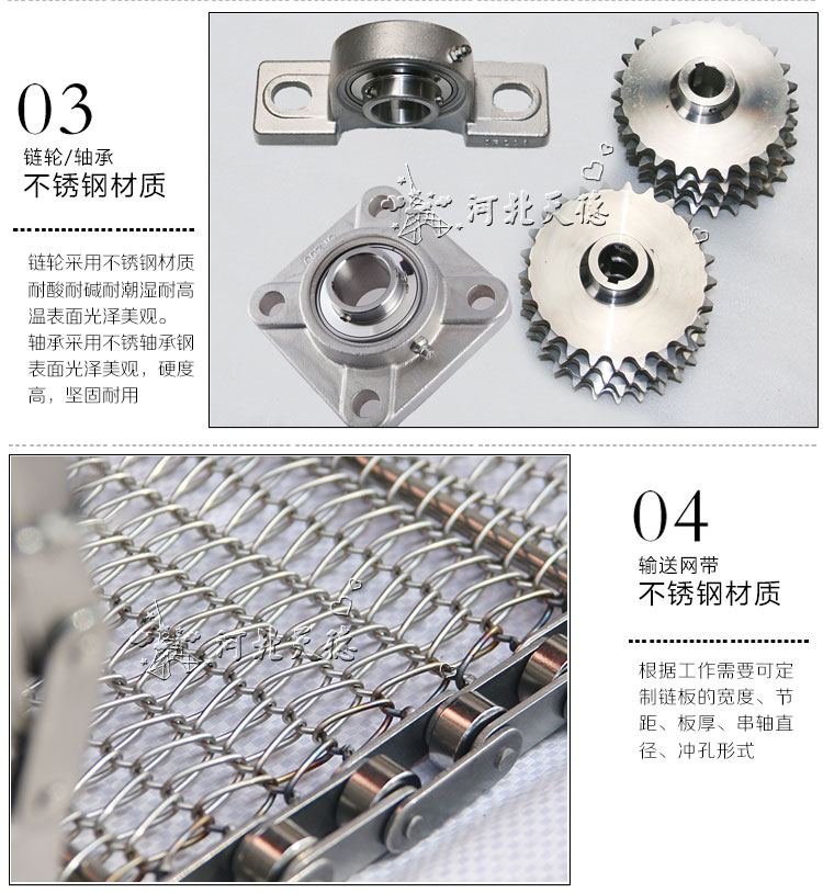 采用不銹鋼網(wǎng)帶作為載體,適用于各種食品行業(yè)的烘干、去濕、冷凍等、熱處理等;不銹鋼制成,具有耐高溫、便于清洗等特點。